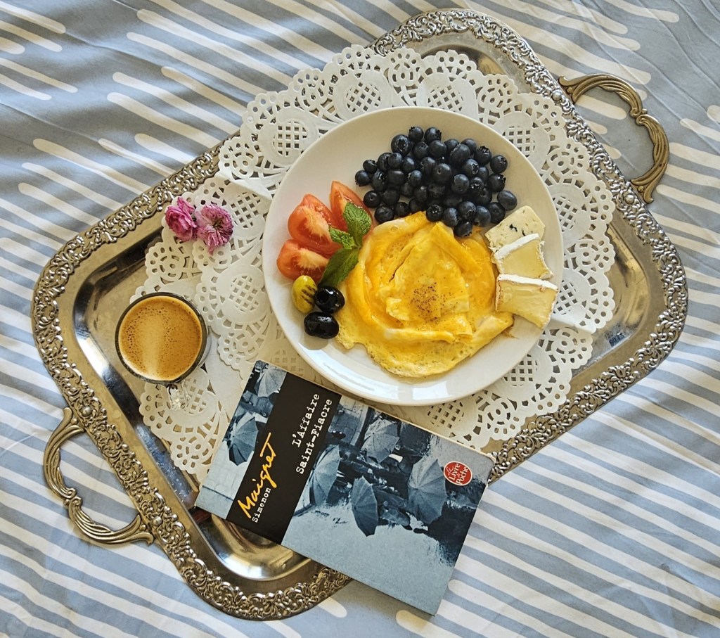 I move the tray to my bedroom, lay the breakfast on my bed, let the morning sun spill across the sheet, and take a breath of calm.
